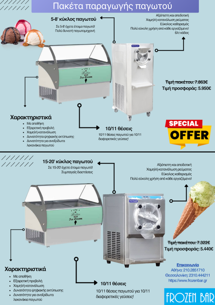 Δείτε τις διαθέσιμες επιλογές πακέτων σε παγωτομηχανή και βιτρίνα καθώς και τις γεύσεις που υπάρχουν διαθέσιμες.